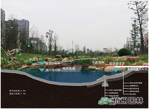 旱溪布置于帶狀綠地低洼處。設(shè)計(jì)時(shí)仿造自然界中干涸的河床,配合濕生植物的營造,在意境上表達(dá)出溪水的景觀。降雨時(shí)可減緩地表徑流,起到緩排作用。旱溪底部接盲管,將水導(dǎo)入中央湖區(qū),進(jìn)行儲存。