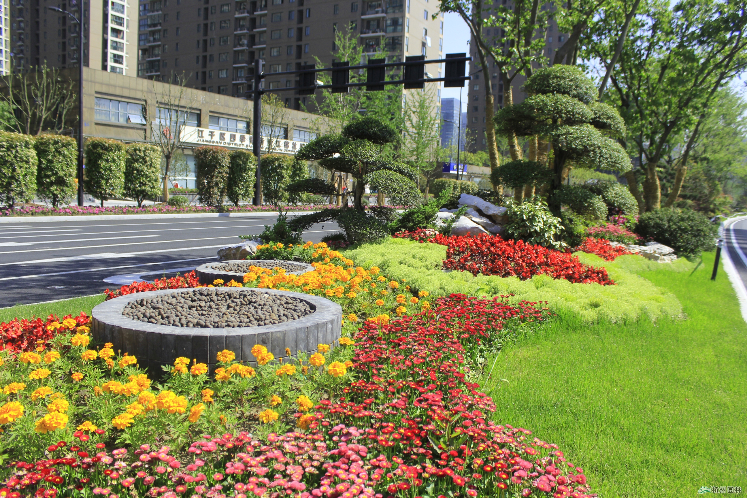 在道路十字路口及一些重要節(jié)點(diǎn),則通過造型樹、球類植物、景石等的有機(jī)結(jié)合,采用盆景化的造園手法,景觀效果獨(dú)具特色。從而使得新塘路成為四季常綠、三季彩葉、全年花開不斷的“最美”迎賓大道。