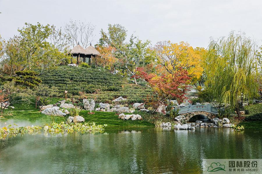 契合展區(qū)主題的樾香亭臨湖而立,雙坡屋面,八柱敞亭,柱子上書(shū)五言聯(lián)“魚(yú)樂(lè)人亦樂(lè),泉清心共清”,盡顯悠閑舒適的情趣。在亭內(nèi)憑欄而坐,側(cè)耳聽(tīng)風(fēng)雨,迎風(fēng)嗅花香。抬頭遠(yuǎn)望,荷葉亭亭的水面上,有魚(yú)兒在水中嬉戲;曲折的長(zhǎng)橋上,游人在漫步觀景;水岸邊,銀杏、三角楓、烏桕等色彩繽紛,編織出一幅深秋的美麗畫(huà)卷。