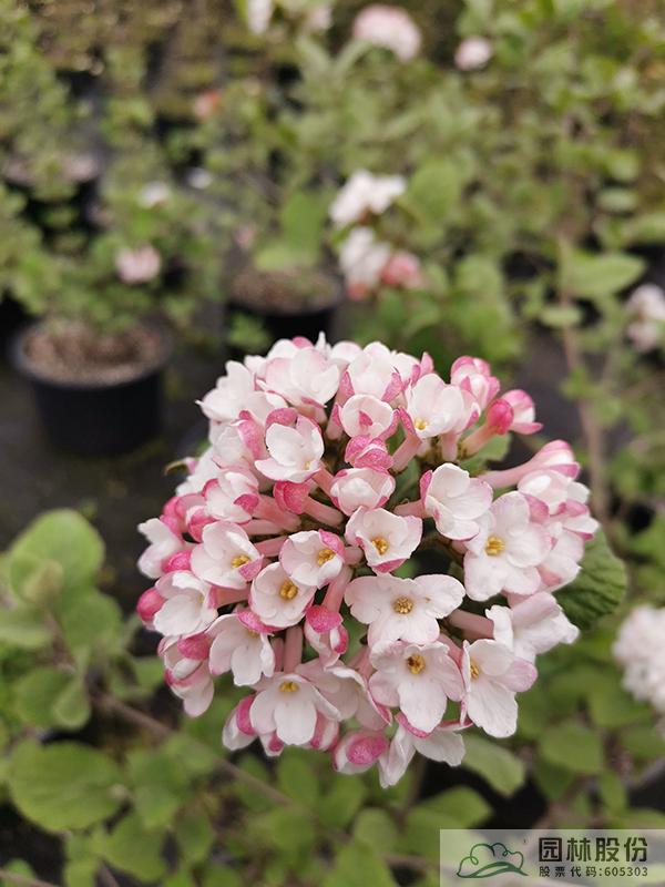 忍冬科莢蒾屬,半常綠或常綠灌木,株高2-3 m,為紅蕾莢蒾和煙管莢蒾的雜交種。葉色深綠,秋季轉紅,顏色程度因所處地區(qū)而異。該種繼承了紅蕾莢蒾粉花的優(yōu)良基因,花序未開放時呈現(xiàn)靚麗的粉色,開放后白色,且具有較濃郁的花香?;◤揭话?.5-10 cm,花期3-4月。植株具有良好的頂端優(yōu)勢,枝條年生長量大,但分枝能力稍弱。幾乎無病蟲害。適應性強,生長速度快,耐干旱且耐寒,適合自然風格的工程應用或庭院觀賞。