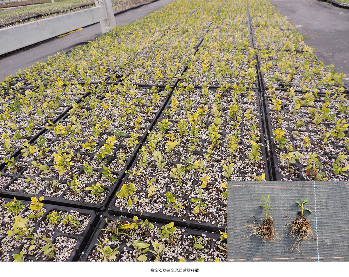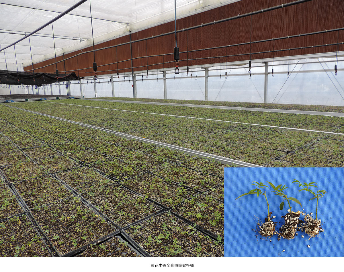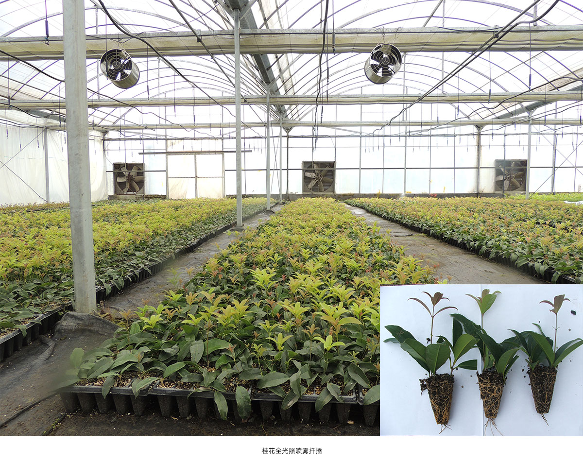 全光照噴霧扦插技術具有生根期短、成活率高和操作簡單等優(yōu)點。研究院已建立了桂花、冬青、降香黃檀、新優(yōu)宿根植物等數(shù)百種植物的全光照噴霧扦插技術體系,年度育苗量200多萬。