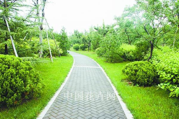 而在道路十字路口的節(jié)點(diǎn)處,則主要是用10厘米×10厘米的小花崗巖鋪地,鋪出來的路面整潔、平坦,看似簡單,實(shí)則對施工技術(shù)要求相當(dāng)高。草坪中的地面鋪裝,則采用花崗巖汀步,用錯縫鋪裝法,兩塊花崗巖之間用草皮鑲嵌,就像給每塊花崗巖鑲了一道綠邊,與旁邊的草坪和諧地融為一體。貫穿整個工程的游憩步道,全部采用“人字形”的鋪裝方法,中間用透水磚、兩邊以花崗巖鑲邊,透水磚價(jià)格不高,用以鑲邊的花崗巖是利用了鋪裝中剩余的邊料,雖然用料簡單,但通過對技術(shù)的嚴(yán)格要求,鋪出的路面整潔而不失韻味,是一種實(shí)用、環(huán)保、節(jié)約的做法。