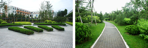 每個景觀節(jié)點(diǎn)上,植物的配置方法都是不一樣的,如在下沉廣場,主要是以小龍柏、金葉女貞等小灌木片植成方形或弧形,間或點(diǎn)綴石楠、梅樹,看起來規(guī)整、簡潔;而在設(shè)計風(fēng)格為江南園林的南廣場上,是將貴重的造型油松單植,通過不同的組合,形成三個風(fēng)格相近的綠島,周邊種植美人蕉、玉簪、竹子,并砌起白墻,上面開圓形拱門或圓窗,散發(fā)出詩意江南的靜謐和婉約氣息?!坝雾降朗秦灤┱麄€景觀的軸線,為了形成曲徑通幽的景觀效果,我們將對植、孤植、叢植都多種方法結(jié)合運(yùn)用,特別是在三叉路口,多種植海棠、櫻花、杏花等,一方面,花開的時候,綠葉間繁花點(diǎn)點(diǎn),會吸引人們不斷向前探尋更多的美景;而花落之后,茂密的枝葉又形成隱隱約約的視覺感受,前方轉(zhuǎn)過彎后風(fēng)景什么樣,又讓人很想去看看。”高經(jīng)理笑著說。