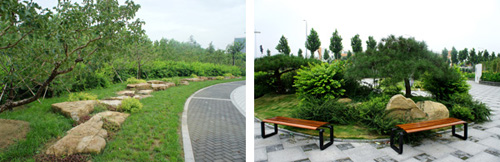 而在道路十字路口的節(jié)點(diǎn)處,則主要是用10cm×10cm的小花崗巖鋪地,鋪出來的路面整潔、平坦,看似簡單,實則對施工技術(shù)要求相當(dāng)高。草坪中的地面鋪裝,則采用花崗巖汀步,用錯縫鋪裝法,兩塊花崗巖之間用草皮鑲嵌,就像給每塊花崗巖鑲了一道綠邊,與旁邊的草坪和諧地融為一體。貫穿整個工程的游憩步道,全部采用“人字形”的鋪裝方法,中間用透水磚、兩邊以花崗巖鑲邊,透水磚價格不高,用以鑲邊的花崗巖是利用了鋪裝中剩余的邊料,雖然用料簡單,但通過對技術(shù)的嚴(yán)格要求,鋪出的路面卻整潔而不失韻味,是一種實用、環(huán)保、節(jié)約的做法。