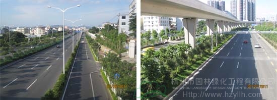 國道205深圳段改建工程景觀綠化工程G5402標(biāo)段,是深圳市龍崗區(qū)迎大運(yùn)重點(diǎn)景觀工程,位于國道205深圳段龍崗區(qū)地鐵三號線愛聯(lián)地鐵站至坪地與惠州市交界處,總綠化面積210000㎡?!耙匀藶楸荆鹬刈匀弧?、“ 處處有綠葉、無處不飛花”等設(shè)計(jì)理念貫穿于工程始終,整條中央綠化帶位于高架橋下,長勢茂盛的各類植物形成一條色彩繽紛的彩帶擁簇著高架橋段,使整條橋段與綠化景觀有機(jī)融合。整條道路的景觀,不僅體顯出一個濱海大都市獨(dú)有的景觀特色,更彰顯出這個城市的生機(jī)活力與熱情奔放。