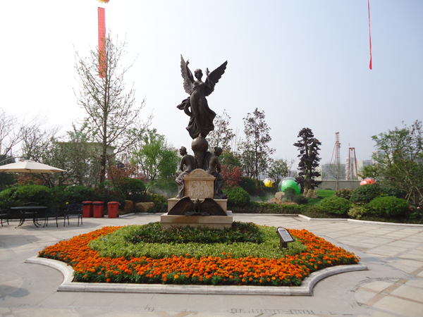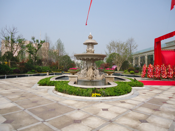 更引人注目的,還有銷售展示中心前面的雕塑噴泉,該噴泉運(yùn)用花崗巖整石雕刻拼接而成,工藝極其復(fù)雜,自上而下不斷灑落的水花,營(yíng)造出一片清涼;無(wú)以復(fù)加的鏤空鐵藝圓頂繁復(fù)花紋和拱門的石材立面裝飾的皇家景觀亭,精致中透露出大氣;潺潺溪流、霧氣繚繞的人工溪澗,如夢(mèng)似幻;大面積的高爾夫果嶺草坪蜿蜒起伏,華貴雍容……