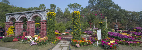 組織參展情況:作品共使用菊花2000余盆,造型菊花25盆,其他外進各類容器苗共80余盆,草坪翻新60方,本著生態(tài)的原則,施工過程中盡可能的保留了原有植物以及地被,并結(jié)合原地形造景,搭建園藝磚景墻一堵,木平臺18方,主要材料為老石板、青磚、松鱗等的生態(tài)園路(無水泥基礎)貫穿其中。由專業(yè)班組設計施工,歷時20天。菊花展開展以后由2名專業(yè)養(yǎng)護人員每天到場維護管養(yǎng)。