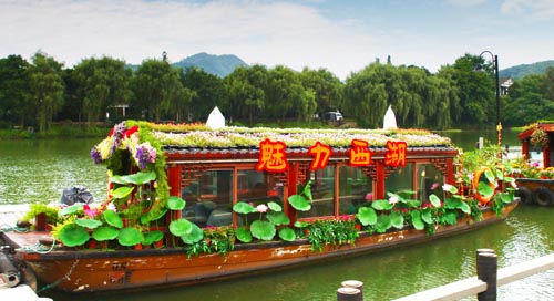 藝術(shù)節(jié)期間,首次在西湖湖面上配置的6艘荷花花船,極大地提高了荷花節(jié)的觀賞性和趣味性,成為西湖中一道流動(dòng)的荷花美景。其中,由杭州市園林綠化股份有限公司設(shè)計(jì)制作的“魅力西湖”荷花游船,將插花技藝與園林布景手法有機(jī)結(jié)合,用康乃馨、勿忘我、太陽(yáng)花等與荷花組景,既突顯了“主角”荷花的秀麗、典雅,又使整艘船的色彩明艷豐富,將熱鬧的節(jié)日氛圍巧妙烘托。