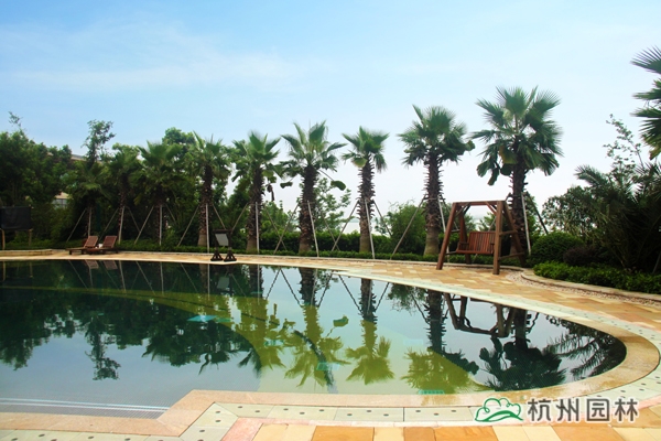 露天泳池區(qū)景觀獨(dú)具特色,選用華棕、棕櫚、布迪椰子、加拿利海棗等熱帶植物作為主景,營(yíng)造出簡(jiǎn)約大方、層次分明的濃郁熱帶園林風(fēng)情。為了提高這些熱帶植物的成活率,降低后期的養(yǎng)護(hù)成本,這批植物都經(jīng)過(guò)馴化,較能適應(yīng)吳江的氣候條件。該區(qū)面積較大,從酒店的觀景平臺(tái)上往下看,泳池中間的小島就像彎彎的小船,仿佛要順流而下;水質(zhì)清澈見(jiàn)底,水底大面積的藍(lán)色和黃色玻璃馬賽克,營(yíng)造出波光鱗鱗的效果,偶有微風(fēng)吹來(lái),水面蕩起陣陣漣漪,流動(dòng)的線條瞬間充滿(mǎn)了生機(jī)和活力,整個(gè)泳池仿佛都動(dòng)了起來(lái)。岸邊的植物高大茂密,郁郁蔥蔥,透過(guò)樹(shù)叢的間隙,浩渺無(wú)邊的太湖水系與遠(yuǎn)處的天際線連接在一起,恍然之間,好象是來(lái)到了充滿(mǎn)陽(yáng)光、海浪、沙灘的南國(guó)熱帶海域,心情的舒暢不言自喻。