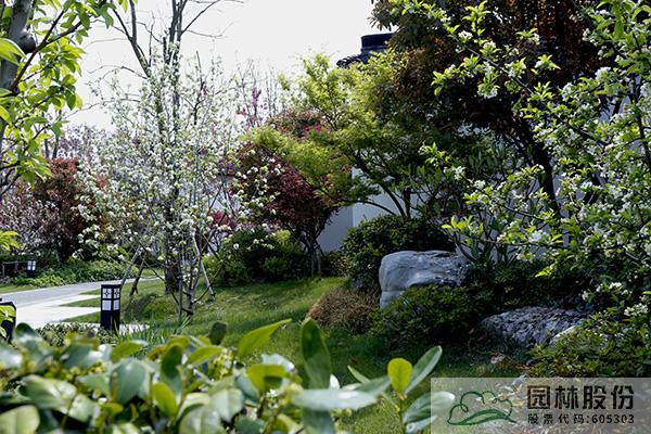 曲折的小橋?qū)@中的水系一分兩半,一邊是平面的水面,一邊是層層跌落的流水,動靜結(jié)合,意蘊悠遠,帶給人們更加豐富的景觀體驗。而不同的植物配置手法,也讓海棠顯得更加豐姿婥約,優(yōu)美動人。