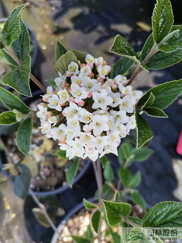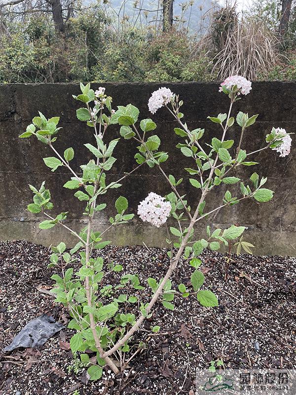 忍冬科莢蒾屬,半常綠或常綠灌木,株高2-3 m,為紅蕾莢蒾和煙管莢蒾的雜交種。葉色深綠,秋季轉紅,顏色程度因所處地區(qū)而異。該種繼承了紅蕾莢蒾粉花的優(yōu)良基因,花序未開放時呈現(xiàn)靚麗的粉色,開放后白色,且具有較濃郁的花香?;◤揭话?.5-10 cm,花期3-4月。植株具有良好的頂端優(yōu)勢,枝條年生長量大,但分枝能力稍弱。幾乎無病蟲害。適應性強,生長速度快,耐干旱且耐寒,適合自然風格的工程應用或庭院觀賞。