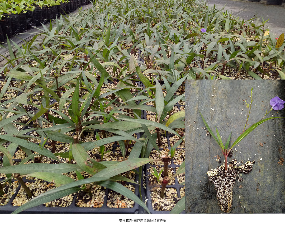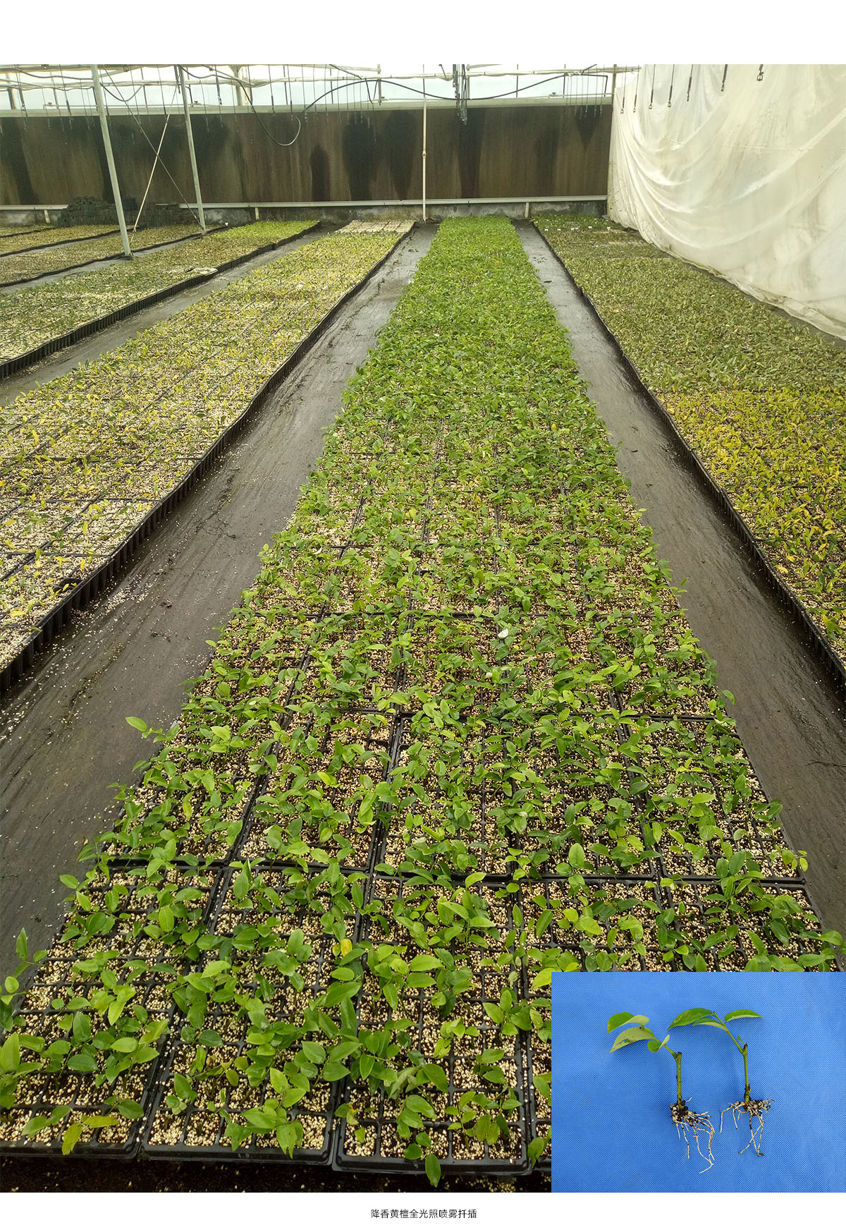 全光照噴霧扦插技術具有生根期短、成活率高和操作簡單等優(yōu)點。研究院已建立了桂花、冬青、降香黃檀、新優(yōu)宿根植物等數(shù)百種植物的全光照噴霧扦插技術體系,年度育苗量200多萬。